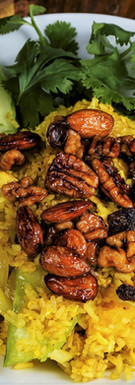 Beef, bok choy, pineapple, egg, onions, raisins, seasoned with turmeric spices, drizzled with caramelized tamarind almonds, walnuts, and pecans
