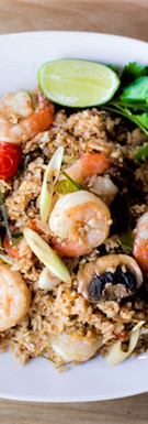 Shrimp fried rice with eggs, onions, mushrooms, lemongrass, tomatoes, seasoned with tom yum spices
